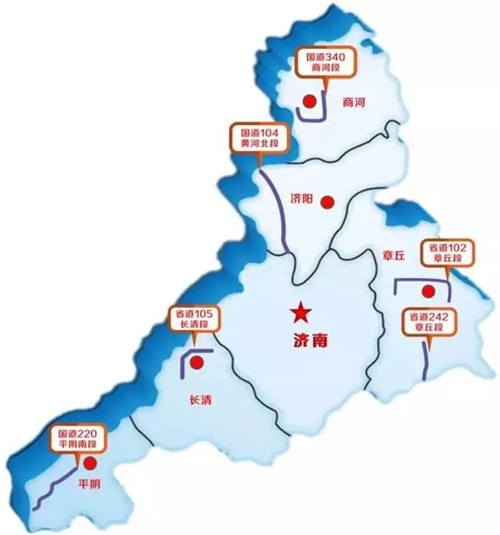 104国道改建工程全长29.7公里,南起天桥区大桥镇220、308国道交叉口,途径济阳,与青银高速相交于靳家互通立交,止于德州界。