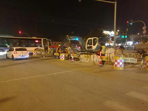 各管线横穿济微路的施工过程中,考虑到济微路为南北交通主干道,本着“少封一米是一米”的施工理念,从减少交通影响,保证车辆和行人通行角度出发,不但将施工全部安排在夜间10点之后,而且经过反复优化施工分区,将原计划半幅封闭缩小到逐车道封闭的方式进行,早6点高峰来临前恢复交通。