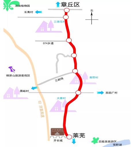 沿线旅游资源丰富,古文化遗迹众多,直通齐长城、平郭城遗址、锦屏山风景区、吕祖泉旅游区,途径三德范、西王黑、大寨、田广等历史悠久古村镇,到莱芜雪野湖景区仅需15分钟车程。