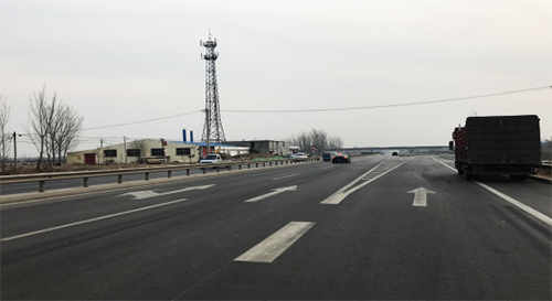 为提示驾驶员按车道行驶,避免驾驶员疲劳驾驶,该项目除设置纵向振动标线外,横向还设置了更加醒目的红色振动标线,既提高了车辆行驶的安全性,又提升了标线视觉上的警示功能,给单调的路面增添了一份色彩。
