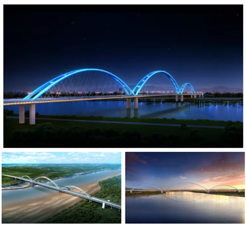 两座大桥都采用了公轨合建、同层布置的桥梁形式,该形式可集约利用过河通道资源,降低工程规模,节省工程投资,拱肋从主梁桥面公路交通与轨道交通之间穿过,兼顾景观效果及行车安全。