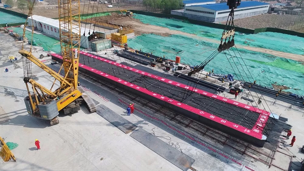 首幅地连墙钢筋笼重达112.7吨,在焊接区完成后,由两台履带吊履带车吊起,整个吊装入槽过程一气呵成。入槽后,随后展开混凝土浇筑,共浇筑混凝土365立方米。北岸始发井共设计77幅同等规模的地连墙,最大埋深51.5米。