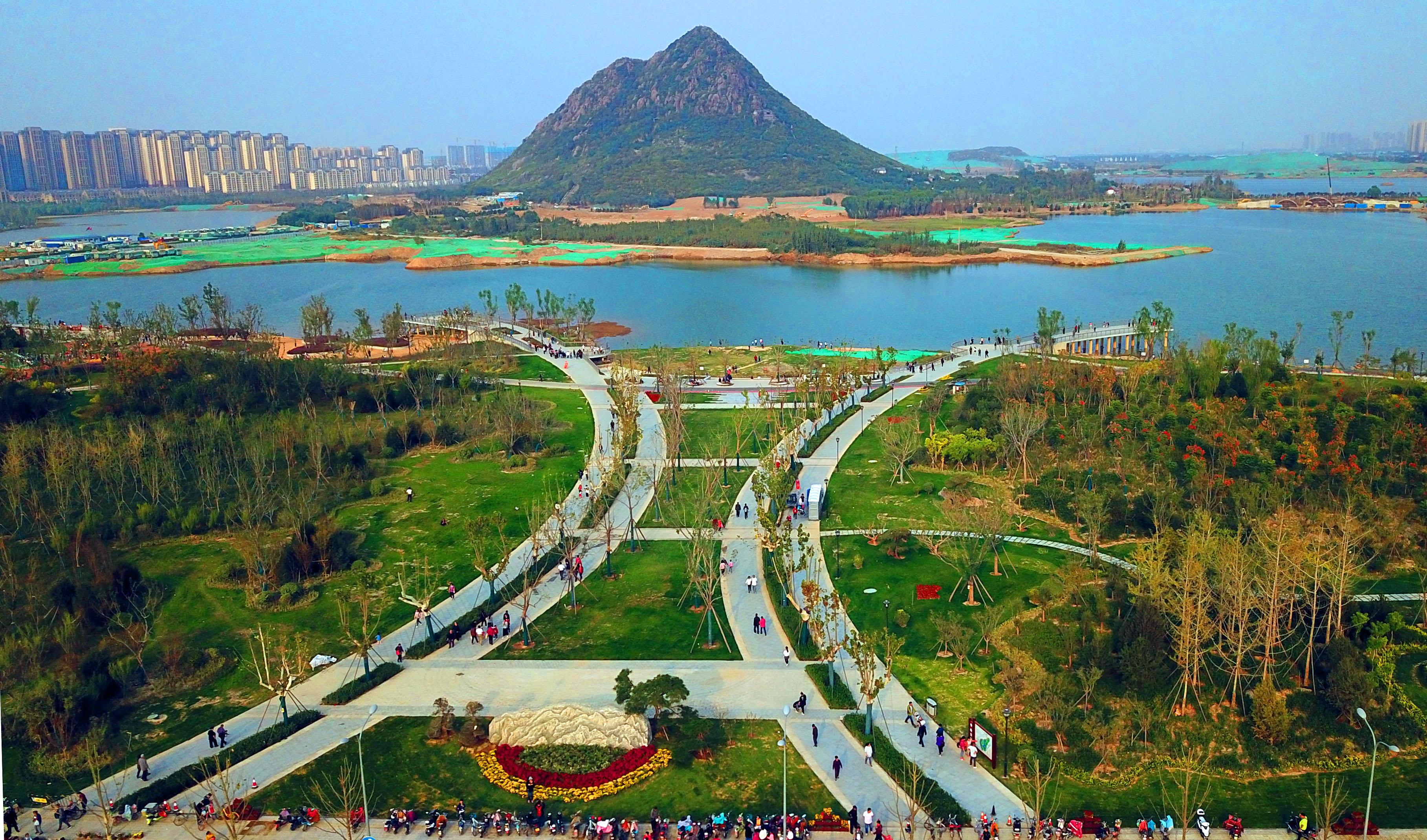 华山西、南、北三侧的园林景观绿化工程已基本竣工,景观达到预期效果,华山东侧的主体景观建设已基本完成;