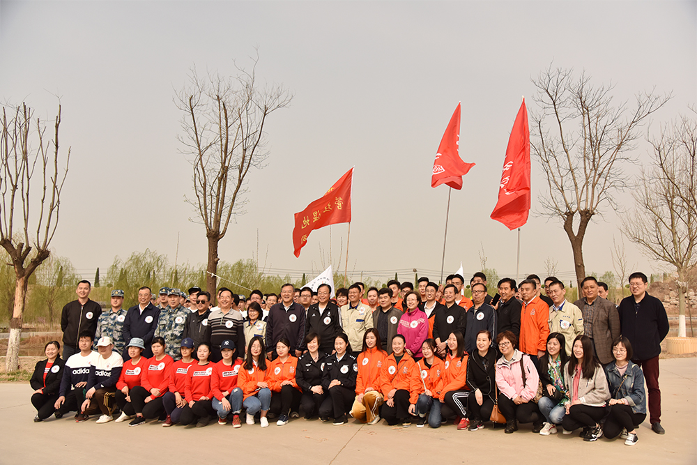 植树现场大家繁忙有序、干劲十足,在技术人员专业指导下,一部分同志穿戴各自的工装、迷彩服,挥舞着自己的队旗,佩戴着“造绿济南,志愿奉献”的LOGO徽标,铲土挖坑、扶苗栽树;还有一部分同志对去年栽种的100多棵北美海棠树进行培土、浇水、剪枝,并对周边的垃圾进行拾捡清理为内容的“回头看”劳动。在大家共同努力下,经过一个半小时的忙碌。共栽植近200余棵木槿树。