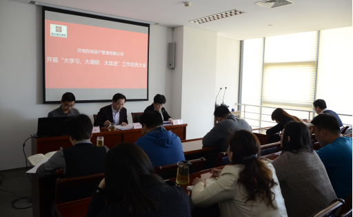 2018年4月9日,济南西城资产管理有限公司组织召开“大学习、大调研、大改进”工作动员大会。会议由资产公司副总经理杨坤同志主持并宣读《济南西城资产管理有限公司开展“大学习、大调研、大改进”工作实施方案》,副总经理陈向勤同志宣读《济南城市建设集团创建全国文明单位工作方案》,董事长兼总经理颜丙根同志就以上工作作动员讲话。