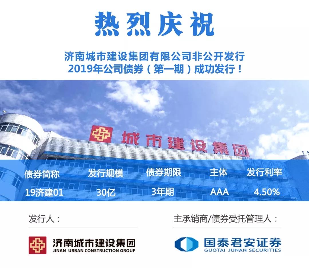 4月12日,济南城市建设集团非公开发行2019年公司债券(第一期)成功发行。济南城市建设集团公开市场首期债券在当天完成簿记,并发布3月社会融资规模、进出口数据超预期回暖的不利市场情绪中,成功发行30亿元,债券期限为3年期,发行利率为4.5%(低于3年期贷款基准利率4.75%)。
