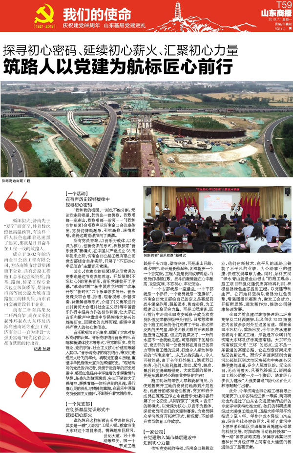 谁能想到这样新颖音乐党课的背后,其实是一群“大老粗”工程人呢。就拿济南大东环这个项目来说,需跨越东巨野河、世纪大道、经十东路等难关,哪一个节点工程都是千头万绪、亟待突破,可是逢山开路、遇水架桥,路还是要修起来,困难就要一个一个去克服。工程人就是要用成绩说话,当党员们唱起红歌,战斗的激情就在心中激荡,攻坚克难,不忘初心,牢记使命。