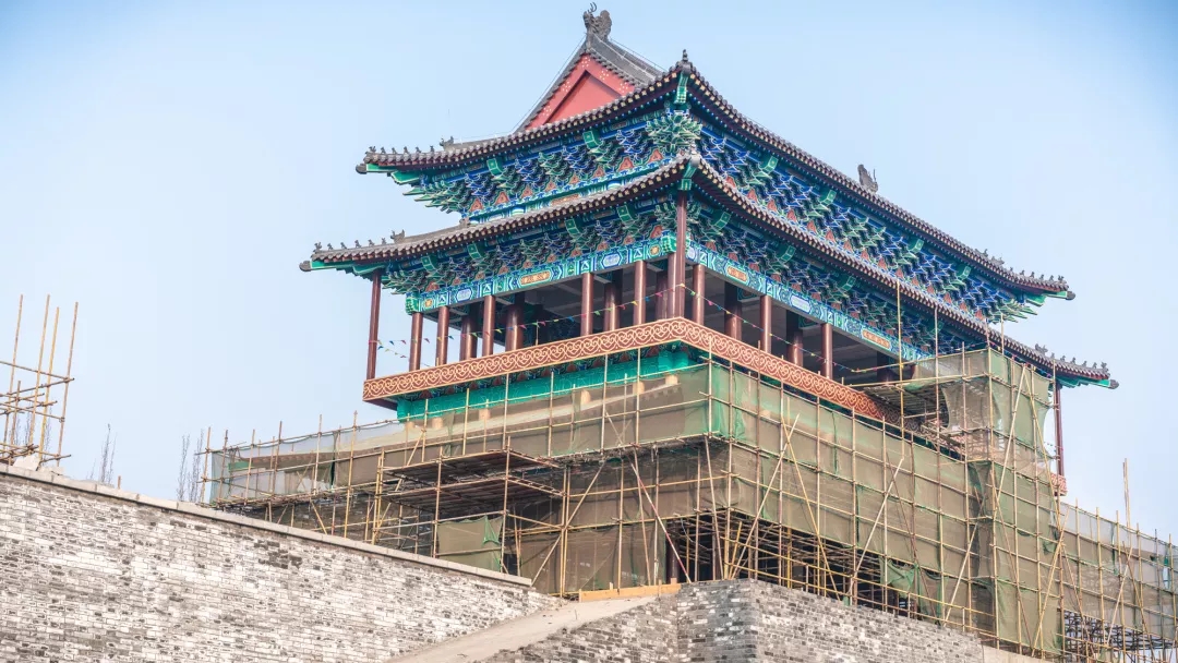 项目所有建筑中,最具标志性的当属城门楼,同时,这也是项目内工程量最大、工期最长的单体建筑。其中城墙高度为8.7米,城门楼最顶端高度为29.5米。仅城门楼施工使用的钢管就已达20万米,占整个项目钢管消耗量的近一半,从基础施工到主体完工,耗时近4个月。城门楼的彩绘部分采用的是旋子彩绘形式,用或圆润饱满、或流畅柔韧的各色线条旋转盘结而成,最大的特点是在藻头内使用了带卷涡纹的花瓣,旋子常用于殿式彩画,既素雅又华美。