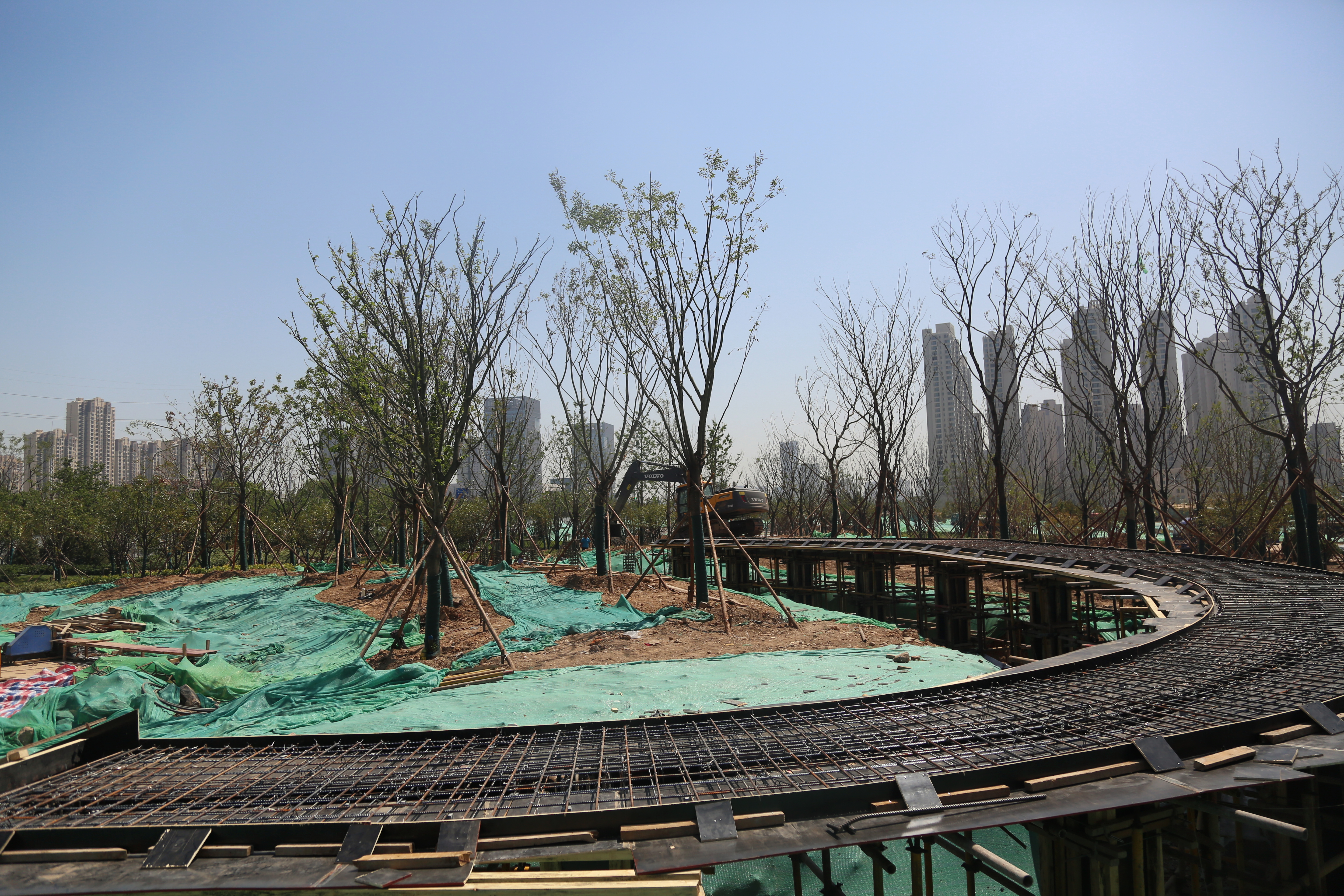 项目自4月底进场施工以来,已完成拆迁并具备施工条件的区域正全力推进建设中,目前正进行湖区土方外运、公园绿化景观打造、园路混凝土浇筑、广场基础开挖、游船码头开挖基槽等工作,6月底具备初步景观效果,7月对湖区(已完成拆迁区域)进行注水后将形成6.5万平方米湖面。