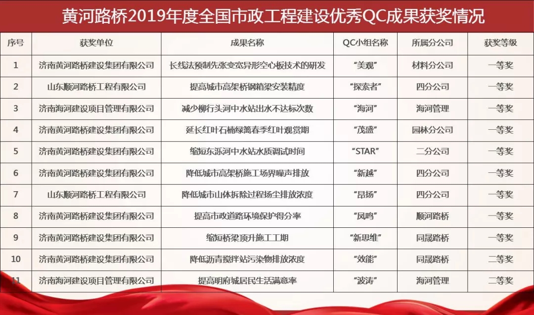 济南黄河路桥建设集团有限公司共有11项成果参与发布,其中9项成果荣获一等奖,2项成果荣获二等奖;同时黄河路桥建设集团被评为2019年“全国市政工程建设QC小组活动优秀企业”,这是自2013年以来连续七年获得此项殊荣。