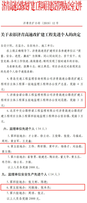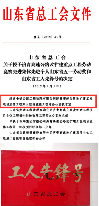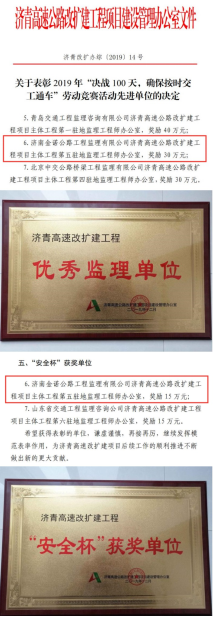 近日,由济南城市建设集团所属济南金诺公路工程监理有限公司承建的济青高速第五驻地办荣获2019年山东省总工会“工人先锋号”荣誉称号, 同时,在2019年度该项目“决战100天,确保按时交工通车”劳动竞赛活动中表现突出,荣获2019年济青高速改扩建工程“优秀监理单位”、“安全杯”获奖单位荣誉称号;其中,项目负责人获得“优秀驻地监理工程师”称号, 6位同志获得“监理单位先进个人”称号, 2位同志获得“监理单位安全生产先进个人” 称号,共获得专项奖励49.6万元。