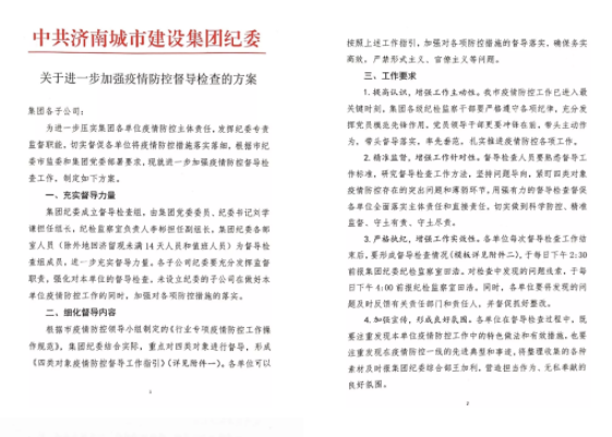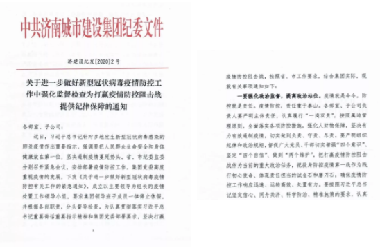 疫情就是命令,防控就是责任。济南城市建设集团把疫情防控作为当前最重要的政治任务来抓,按照中央、省、市委关于做好新型冠状病毒肺炎疫情防控的部署和要求,快速响应,迅速部署,采取有力措施,注重党委、纪委两个责任的协同配合,深化一线督导检查,以最坚决的态度、最严格的执行、最果断的行动,全力以赴推动疫情防控责任落实。