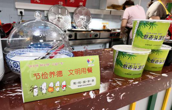 市场管理部协调各餐饮点,主动引导顾客“吃多少点多少,吃剩请打包,千万避免浪费”,对“光盘”或“打包”顾客赠送小礼品,以增强广大顾客的“勤俭节约”意识。