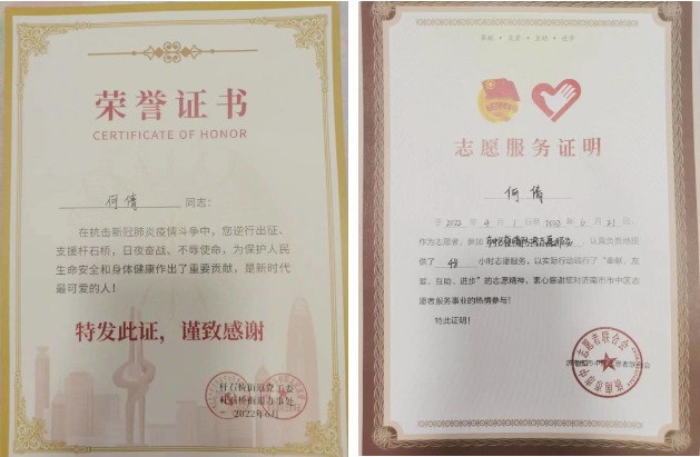 在疫情防控期间,何倩主动请缨,逆行出征,协助杆石桥街道完成核酸检测、物资搬运等疫情防控工作,得到了社区的高度认可。
