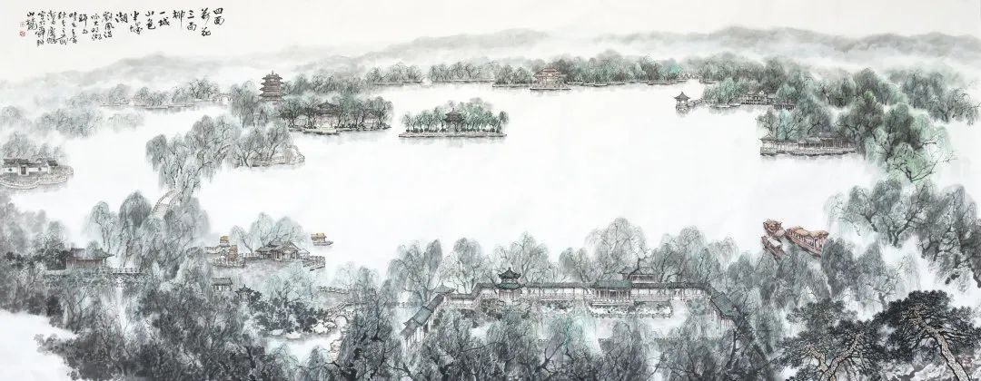 如果将济南的明信片寄往远方,大明湖一定是其中的选择。济南市文联副主席、济南市美术家协会主席李庆杰为此次画展创作的《名湖揽胜》作品,将大明湖旧貌新颜相融合,“四面荷花三面柳,一城山色半城湖”“佛山倒影”等意境跃然纸上,体现了近些年来天更蓝、树更绿、水更清的高质量发展“济南高度”。