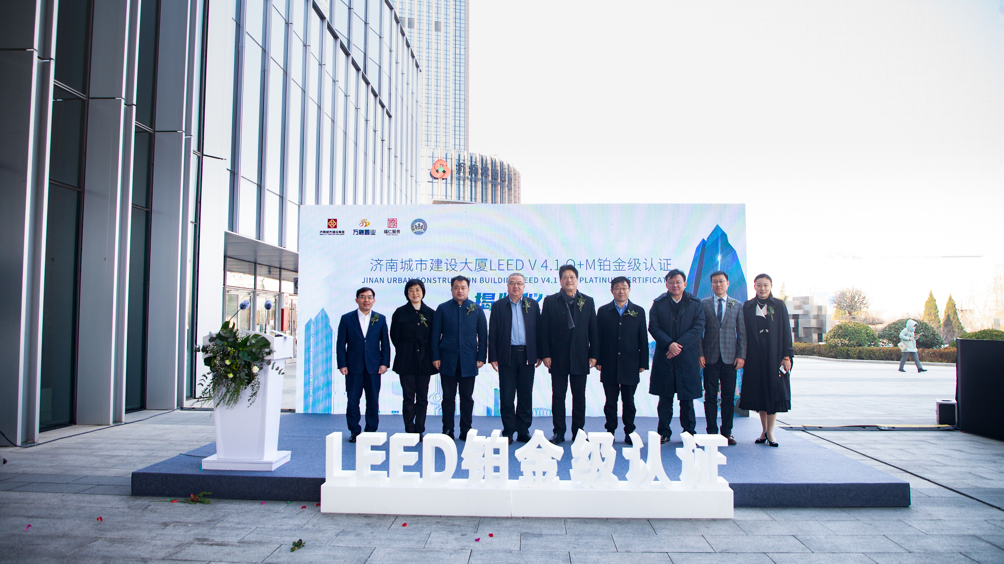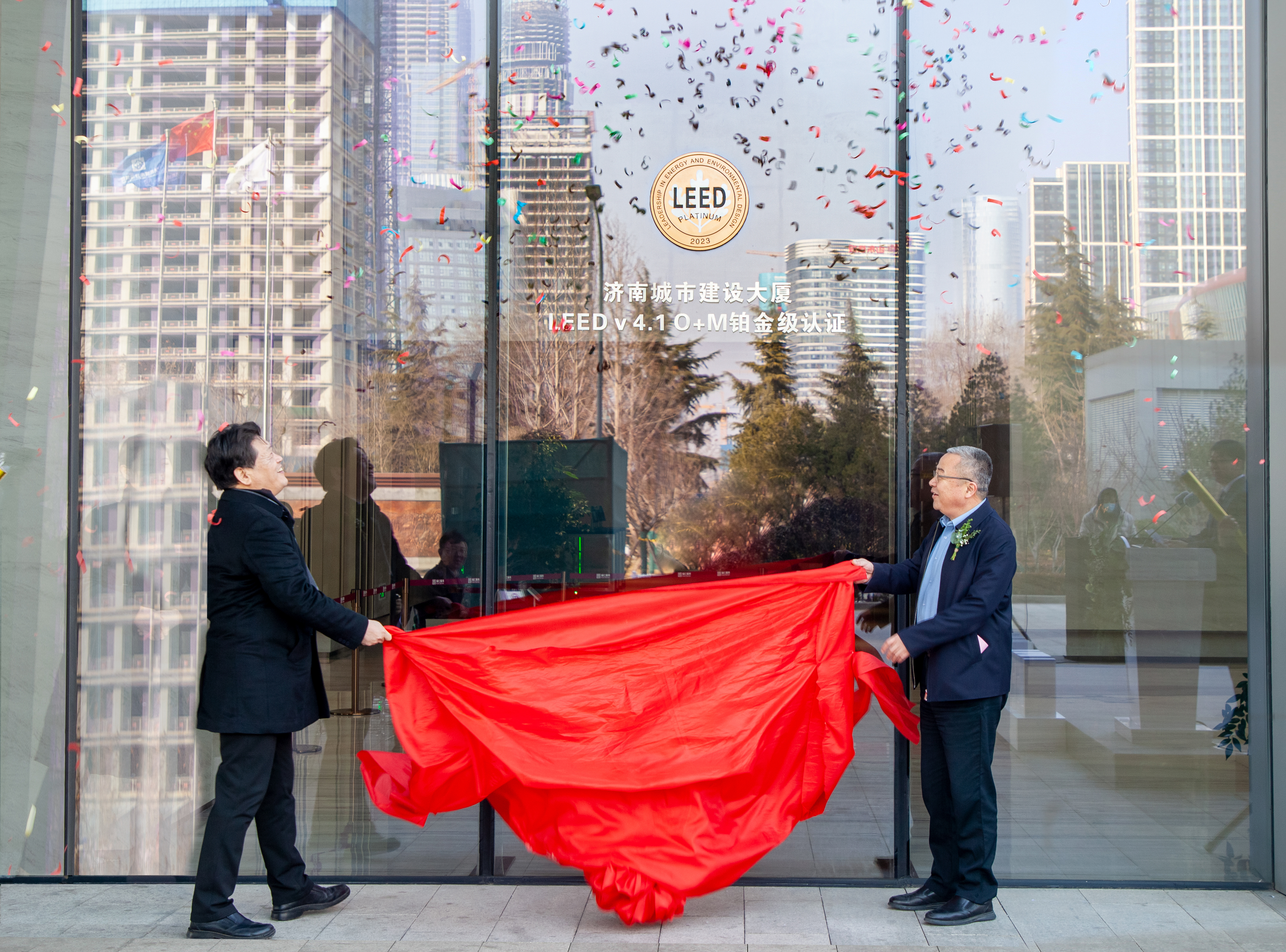 2月16日上午,济南城市建设大厦LEED v 4.1 O+M铂金级认证揭牌仪式举行。市城乡和住房建设局副局长张庆华,市住建局绿色建筑节能与科技处处长满意,建设集团咨询安玉坤,副总经理徐文东,副总经理杨晓东,副总经理侯涛出席活动。万融置业、福仁服务相关负责同志参加活动。