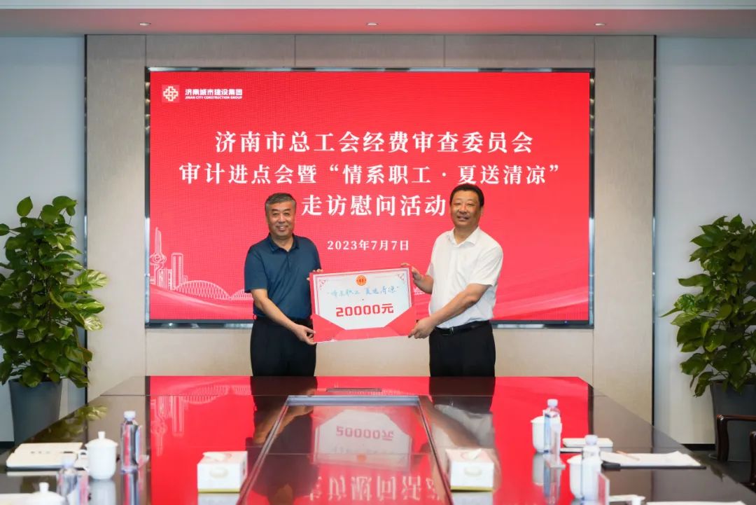 7月7日,市总工会党组成员、经费审查委员会主任刘明忠带队到建设集团开展济南市总工会经费审查委员会审计进点会暨“情系职工·夏送清凉”走访慰问活动,市总工会经审办主任宋强,建设集团党委副书记钟善良出席活动。