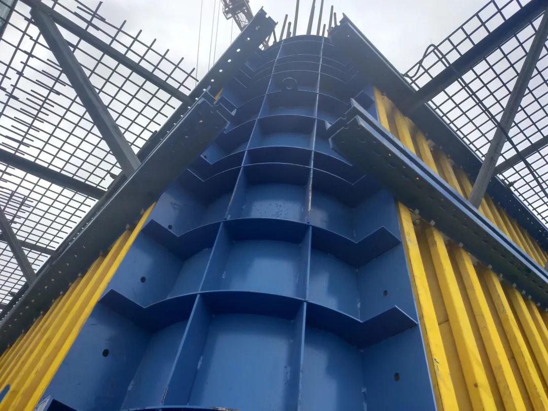 为开辟施工空间,项目自主研发了非钢管落地支撑体系的新型全封闭液压爬模系统,将液压爬模的支点从地面转移到柱体,充分利用了既有结构,最大限度让出施工组织空间。同时全封闭液压爬模系统也在最大程度上保障了施工人员安全。
