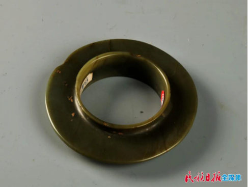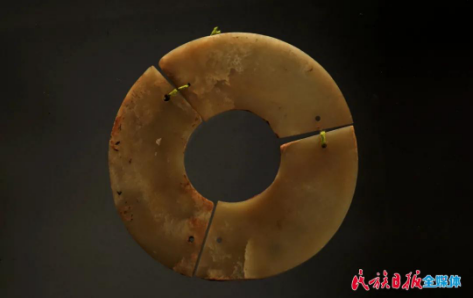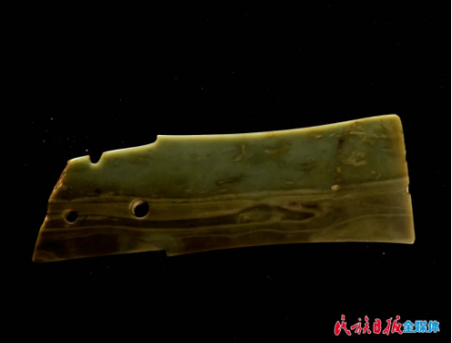 三联璧是该馆的重要藏品之一,这件器物属于透闪石玉,整体呈扇面状,由三件玉片连接而成,每一片都两侧对称,两端钻孔,孔一面大一面小,呈喇叭状,采用单面钻孔法。此套三联璧虽加工简单,但琢工端庄大气、拙朴豪放,它在最初以配饰形式出现,到了齐家文化时期作为祭祀用的礼器,成为权势与地位的象征。