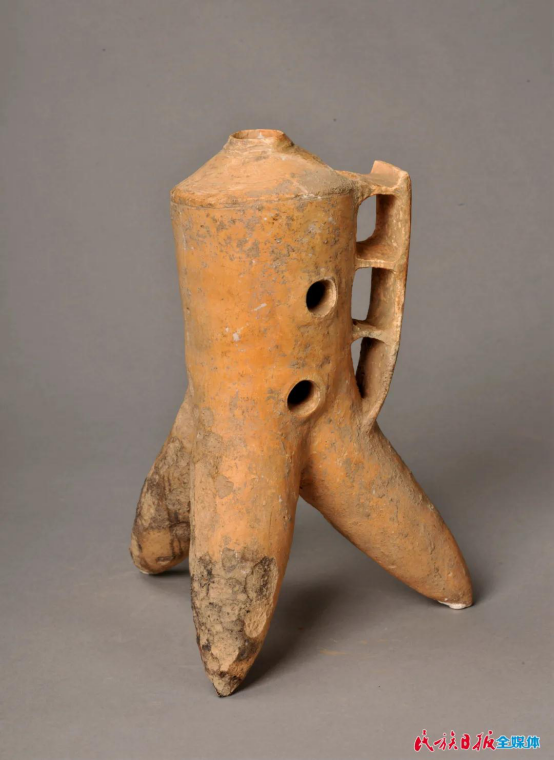 除了玉器,这里还展出了齐家文化最具代表性的器物——陶器。其中一件叫三足盉,是齐家陶器的代表性器物。这件展品问世后,因结构巧妙、制作精良、年代久远且保存非常完整,引起了国际上的关注,获得世界各国专家学者的一致好评。