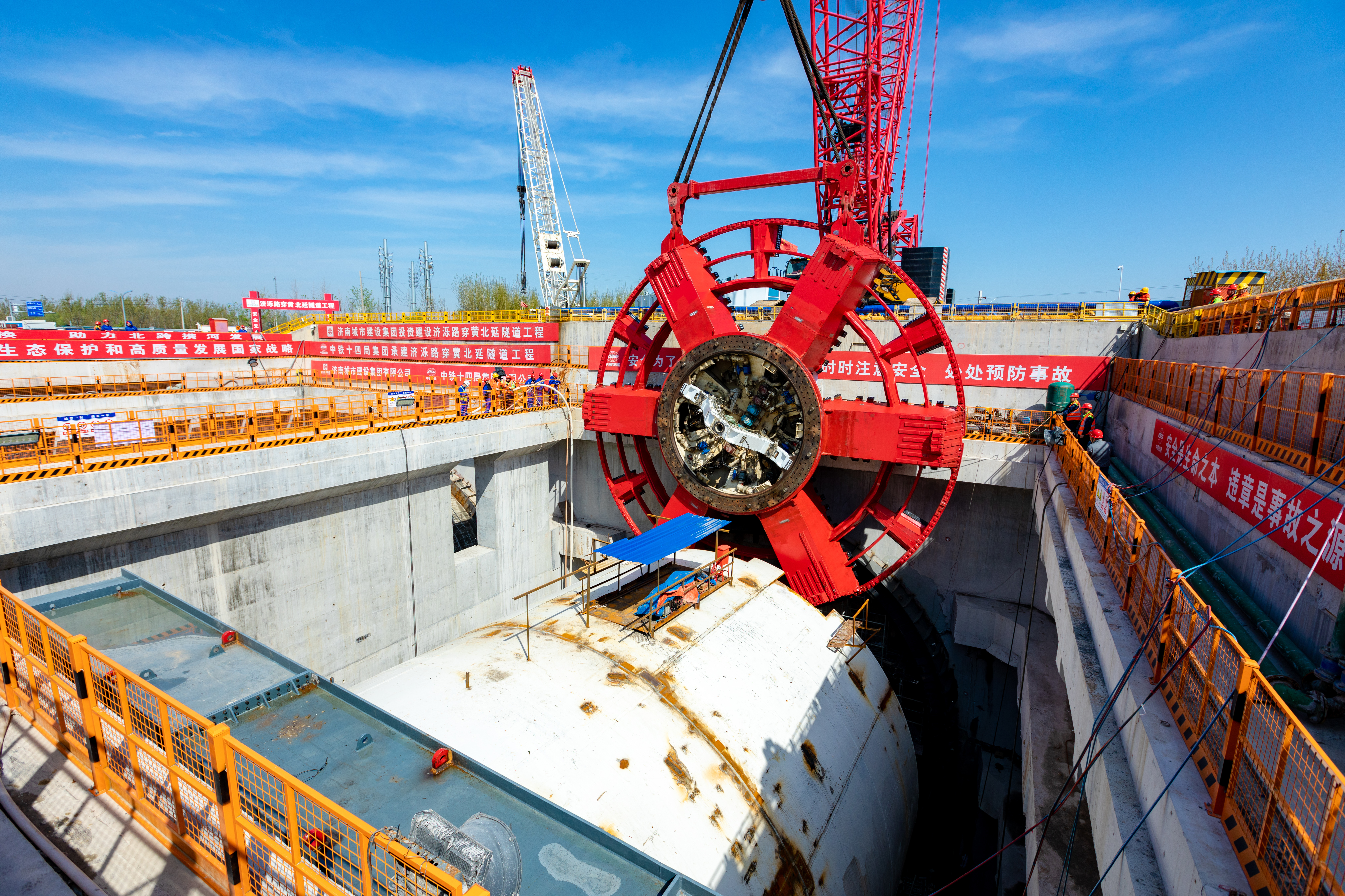 活动现场,与会人员共同启动并见证了北延隧道“泰山号”盾构机刀盘顺利吊装下井。