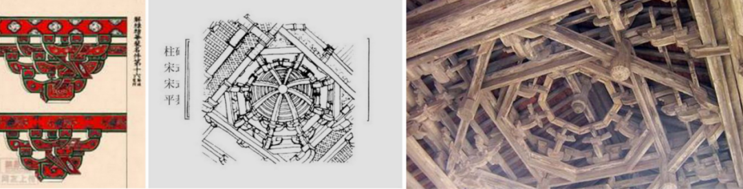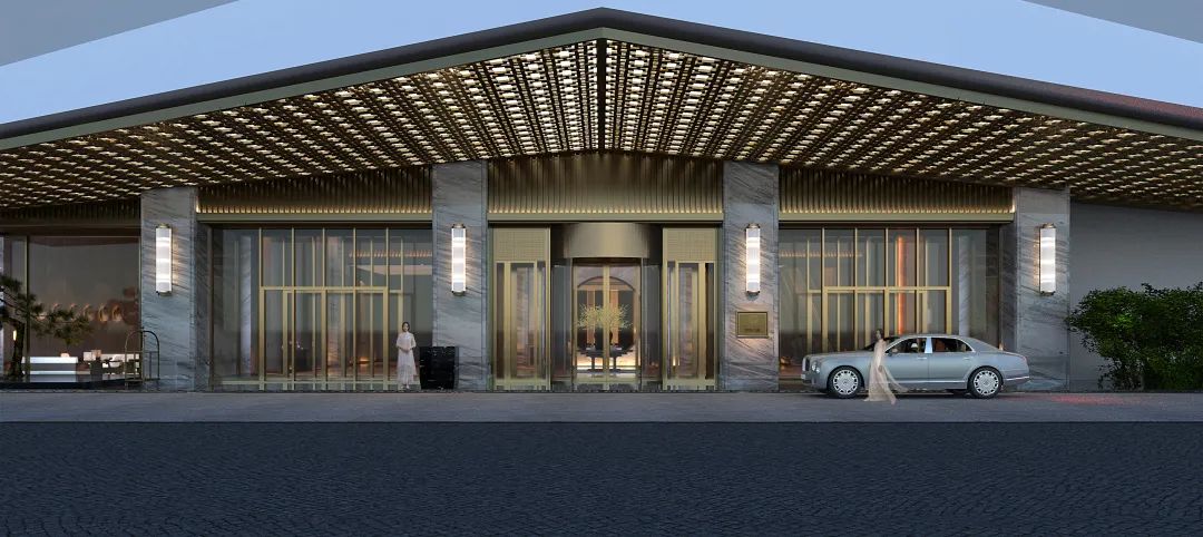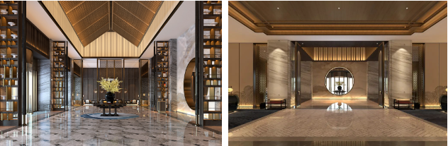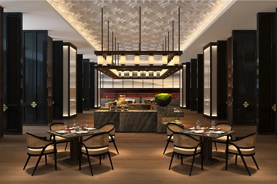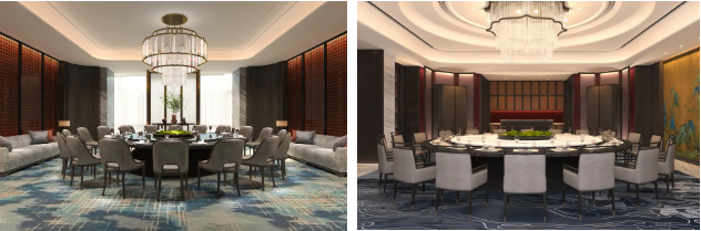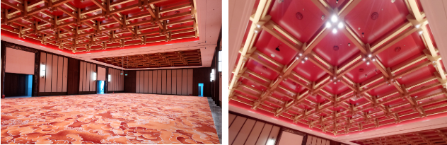 宴会厅天花的设计借鉴宋式屋架结构,通过现代设计手法进行简化概括形成符合现代人审美的造型装置艺术。