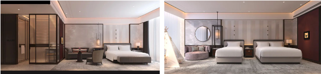 客房区域的设计以“画屏”借助宋代屏风的艺术形态,通过提取、拆解、重构,以中国传统绘画留白的手法契合现代年轻人的审美。