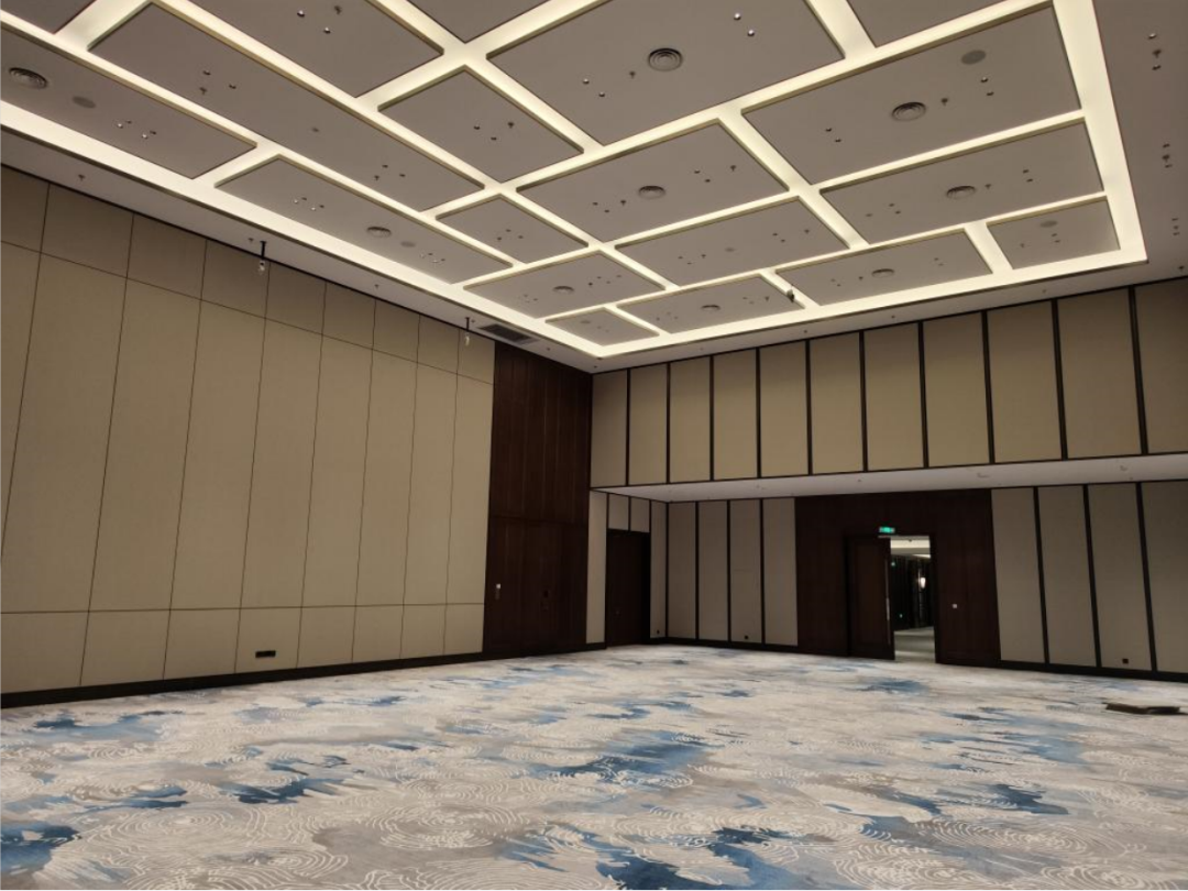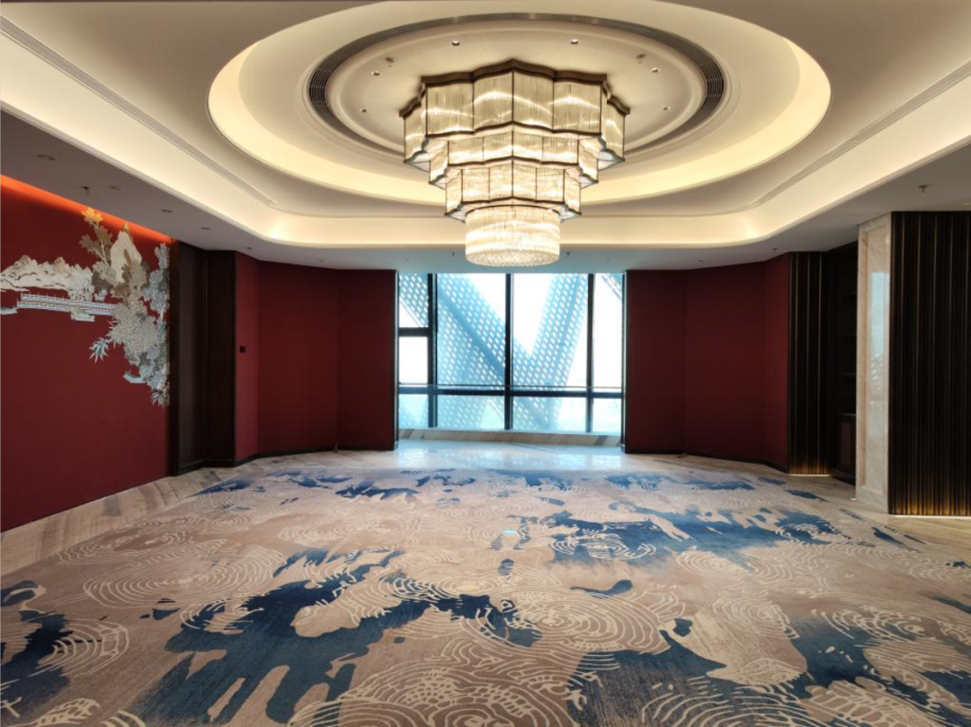 酒店大堂和过厅吊顶为异型铝型材格栅吊顶,大宴会厅吊顶为多层铝方通交错布置造型,项目团队使用BIM建模技术,优化施工工艺提高了施工效率,仅此一项节省工期30天,项目团队群策群力科学组织各项施工,7天完成地毯铺装18000平方米,10天完成墙面硬包安装20000平方米,40天完成大理石铺贴和干挂施工3.4万平方米,项目如期通过验收,为酒店开业奠定坚实的基础。