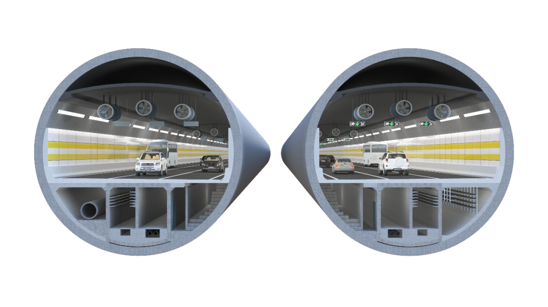 为减少市政管线过黄河成本,充分利用市政隧道下部通道资源搭载穿黄河市政管线,隧道下部预留穿黄河市政管线舱。同时,盾构段采用在车行道路面下设置逃生疏散楼梯与专用逃生救援通道(纵向逃生救援方案),并结合工作井设置车行横通道、明挖暗埋段设置人行横通道的纵向结合横向疏散救援的综合方案,形成可靠高效的疏散救援设施,确保运行安全。