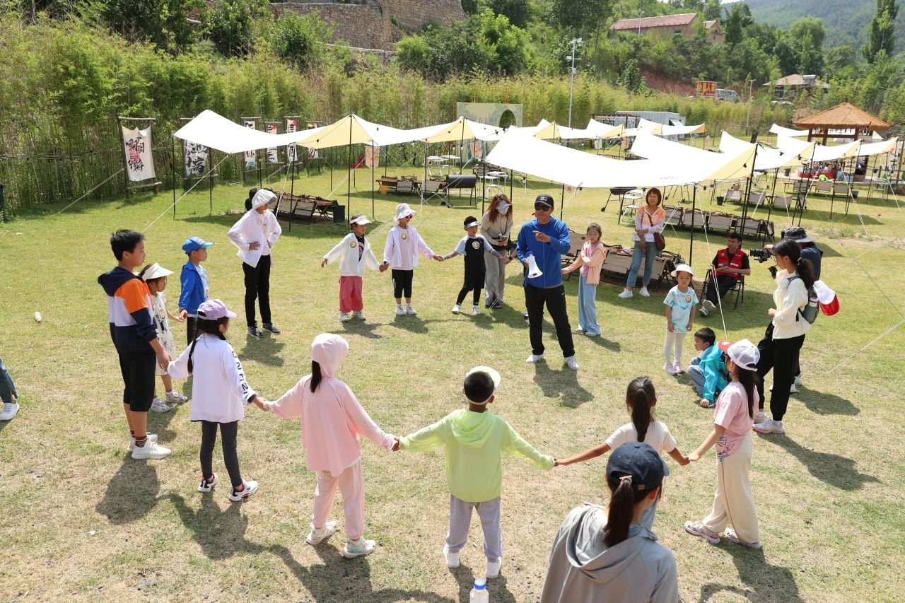 活动第一站,在孙家庄村“柿子树下”露营基地户外草坪组织儿童户外游戏,增进孩子们相互间了解,增强团队合作意识。