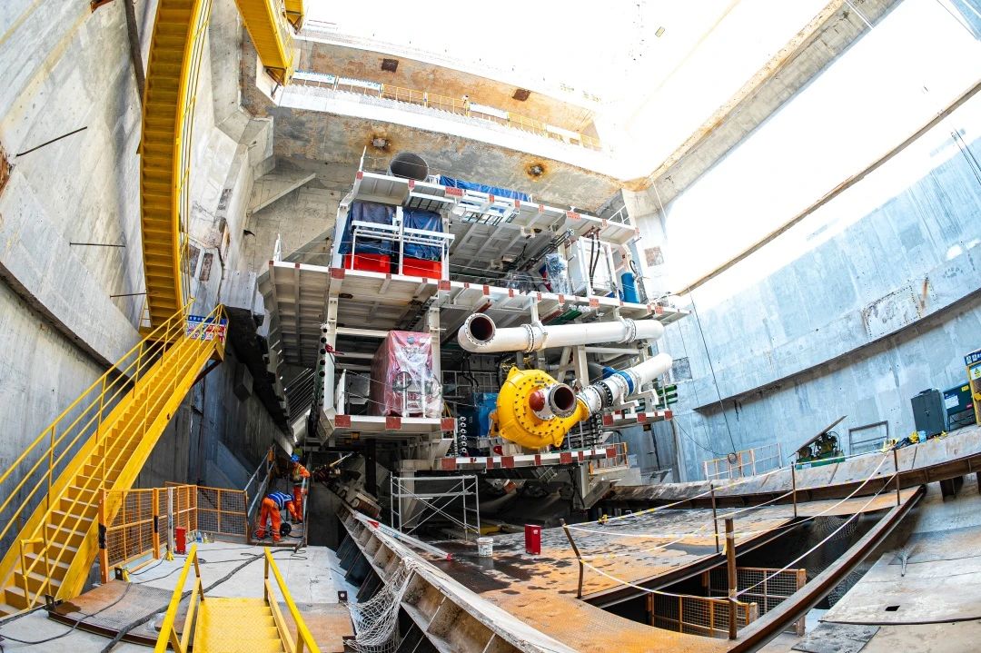 负责盾构施工的“山河号”泥水平衡盾构机,最大开挖直径达17.5米,相当于6层楼的高度,盾构机总长163米、重5200吨、装机总功率12580千瓦。
