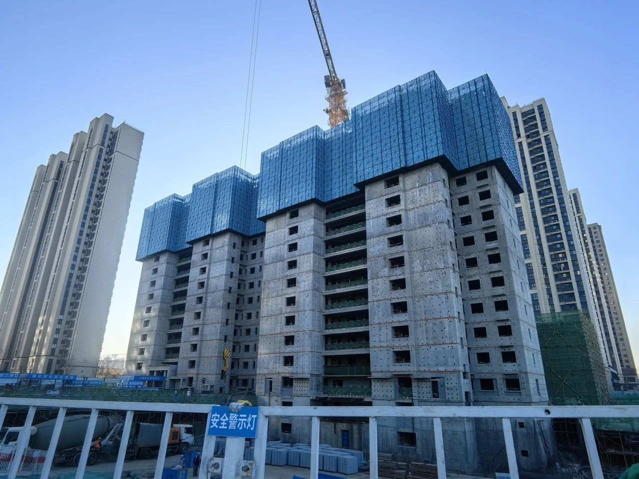 目前,2#楼14层主体结构浇筑完成,负一层负二层二次结构完成;4#楼14层主体结构浇筑完成,负一层负二层,1-4层二次结构完成;15#楼主体结构完成,二次结构完成;车库主体结构完成3/4。