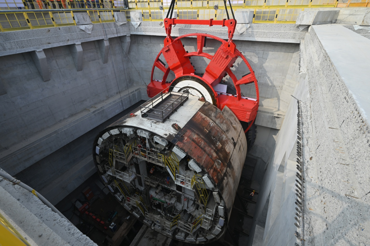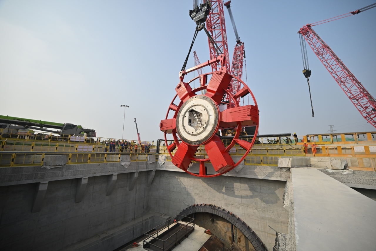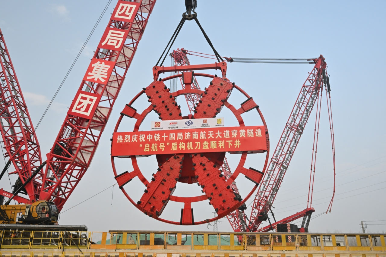 3月1日,直径15.06米的超大直径盾构机“启航号”刀盘在两台履带吊助力下完成“空中转体”后缓缓下井,与盾构机精准“合体”,标志着由济南城市建设集团投资建设、中铁十四局集团承建的济南市航天大道穿黄隧道盾构机主机基本组装完成,即将进入调试阶段。