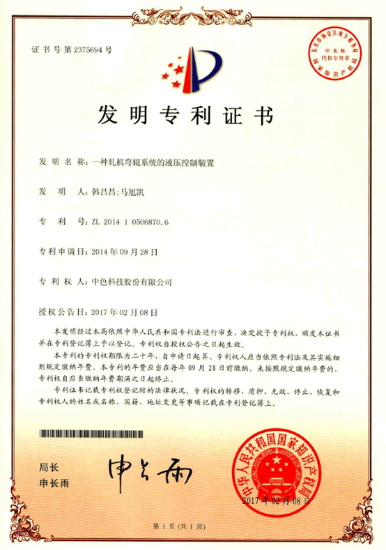专利技术简介:公司设计了一种轧机弯辊系统的液压控制装置,该液压控制装置节省了一个伺服阀,增加一个减压阀,通过二位四通电磁换向阀的合理配置,使其结构更加合理、简单、可靠,降低企业运行成本,减少了维护量。